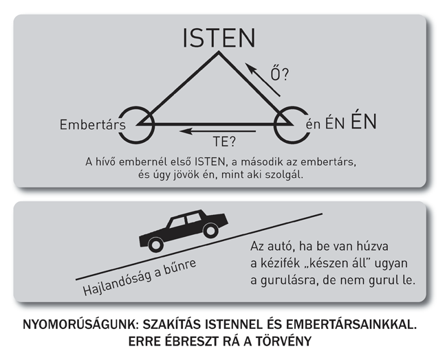 Hogy milyen nagy a nyomorúságunk, azt megérthetjük, ha elolvassuk a Rom 3,9-20-at. Nyomorúságunkat jól megismerjük, ha életünket Isten törvénye szerint megvizsgáljuk. A törvény olyan, mint egy tükör (Jak 1,23); minél többször nézünk a tükörbe, annál többször látjuk, hogy szennyesek vagyunk. Nem szabad elmenni ettől a tükörtől, mint azt az az ember teszi, akiről a Jak 1,24-ben van szó. Éppen azt kell tudatosítanunk magunkban, hogy Isten törvényének kívánalmát nem teljesítjük. Mit kíván Isten? Azt, hogy Jézus Krisztus legyen a tükör, és azt, hogy szeressük Őt, és szeressük felebarátunkat. Egyszóval: szeretetet. Isten azt kívánja, hogy ez a szeretet tökéletes legyen: ezért találjuk a törvény összefoglalásában a „teljes” szót. A nyomorúságunk az, hogy hajlandók vagyunk a törvénnyel ellentétesen cselekedni, azaz Istent és felebarátunkat gyűlölni. Az Istennel való szakításban az a legrosszabb, hogy, amint a Káté mondja: „hajlandó vagyok Isten és felebarátom gyűlölésére”. Nem túlzás ez? Nem, ez az Isten és a felebarát elleni gyűlölet ott él minden szívben. Isten őrző kezének köszönhető, hogy megóv bennünket a gyűlölet fellángolásától. Ezt nevezzük Isten általános kegyelmének.