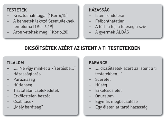 Mivel testünk és lelkünk a Szentlélek temploma, Isten azt akarja, hogy mindkettőt tisztán és szentül őrizzük meg. Ezért megtilt minden parázna cselekedetet, viselkedést, beszédet, gondolatot, vágyat és mindent, ami erre ingerelhetne.